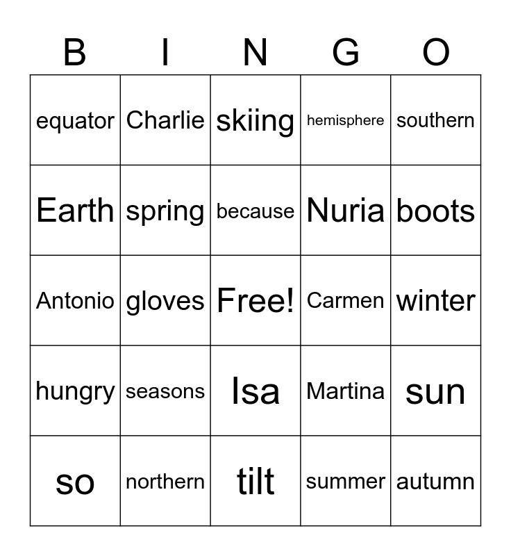 This bingo card has a free space and 24 words: seasons, northern, because, so, southern, equator, Earth, Charlie, Carmen, Isa, Nuria, Antonio, Martina, sun, spring, summer, winter, skiing, boots, gloves, autumn, hungry, hemisphere and tilt.