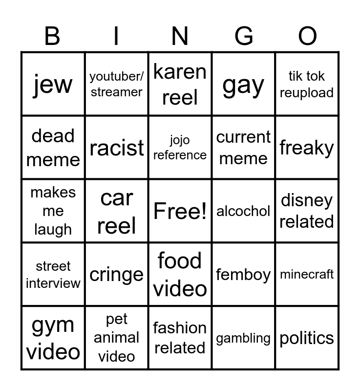 This bingo card has a free space and 24 words: cringe, pet animal video, jojo reference, gym video, tik tok reupload, jew, dead meme, youtuber/ streamer, alcochol, food video, current meme, makes me laugh, femboy, minecraft, racist, gambling, disney related, karen reel, freaky, car reel, politics, street interview, gay and fashion related.