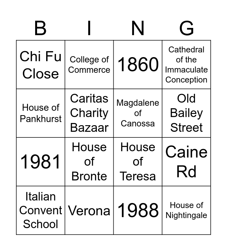 This bingo card has 29 words: Free!, Via, Vita, Veritas, Caine Rd, Robinson Rd, Chi Fu Close, 1860, Magdalene of Canossa, 165, Verona, The Daughters of Charity, 1988, Italian Convent School, Sr Emily Bowring, Our Lady of Grace Statue, House of Bronte, House of Curie, House of Keller, House of Nightingale, House of Pankhurst, House of Teresa, Raimondi, Yu Chun Keung, 1981, Caritas Charity Bazaar, Cathedral of the Immaculate Conception, College of Commerce, St Joan of Arc, Old Bailey Street and The Grand Panorama.