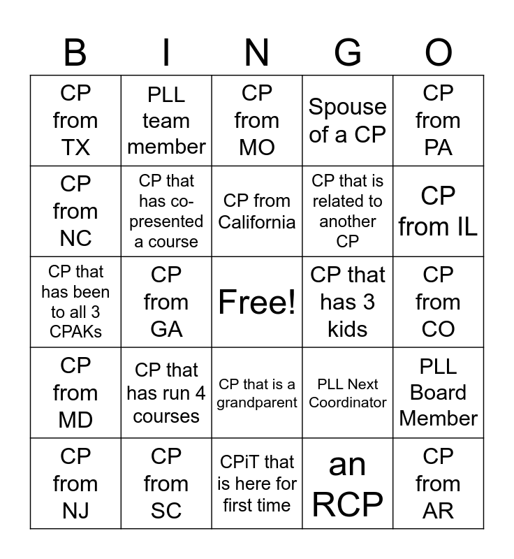 This bingo card has a free space and 25 words: CP that has run 4 courses, CPiT that is here for first time, CP from California, CP from NJ, CP from PA, CP from TX, CP from NC, PLL team member, CP that has 3 kids, CP that is a grandparent, CP that is related to another CP, CP that has been to all 3 CPAKs, PLL Next Coordinator, PLL Board Member, CP that has co-presented a course, CP connected to PLL Global, CP from CO, CP from MO, CP from IL, CP from GA, CP from AR, CP from SC, CP from MD, Spouse of a CP and an RCP.