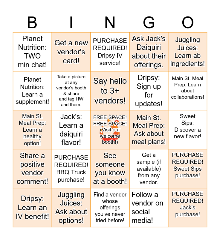 This bingo card has a free space and 24 words: Dripsy: Learn an IV benefit!, PURCHASE REQUIRED! BBQ Truck purchase!, Say hello to 3+ vendors!, Follow a vendor on social media!, Juggling Juices: Learn ab ingredients!, Planet Nutrition: TWO min chat!, Get a new vendor's card!, PURCHASE REQUIRED! Dripsy IV service!, Main St. Meal Prep: Ask about meal plans!, Sweet Sips: Discover a new flavor!, Main St. Meal Prep: Learn a healthy option!, Take a picture at any vendor's booth & share and tag HW and them., Get a sample (if available) from any vendor., PURCHASE REQUIRED! Sweet Sips purchase!, Planet Nutrition: Learn a supplement!, Juggling Juices: Ask about options!, Find a vendor whose offerings you've never tried before!, Ask Jack's Daiquiri about their offerings., Main St. Meal Prep: Learn about collaborations!, Share a positive vendor comment!, Jack's: Learn a daiquiri flavor!, See someone you know at a booth!, Dripsy: Sign up for updates! and PURCHASE REQUIRED! Jack's purchase!.