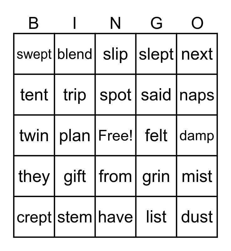 This bingo card has a free space and 24 words: gift, stem, spot, crept, next, swept, tent, blend, felt, from, said, twin, grin, mist, trip, list, damp, slip, naps, plan, dust, they, slept and have.