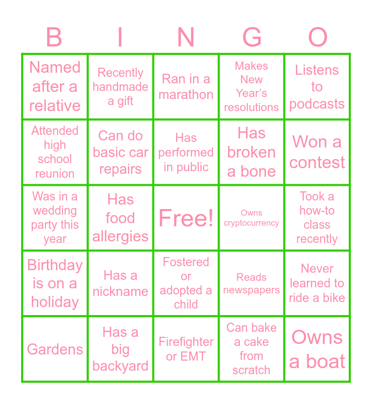 This bingo card has a free space and 64 words: Same birth month as you, Owns same car brand as you, Never flown on an airplane, Never learned to ride a bike, Collects something, Goes all-out on holiday decorating, Recently handmade a gift, Received an award, Has performed in public, Has a BFF from high school, Fostered or adopted a child, Currently a student, Took a how-to class recently, Listens to podcasts, Travels often, Attended high school reunion, Has food allergies, Named after a relative, Has a scar, Has broken a bone, Has a nickname, Birthday is on a holiday, Makes New Year’s resolutions, Good cook, Taught a class, Helped a stranger, Got help from a stranger, Worked at a family business, Visited 4+ continents, Had a long-distance relationship, Took dance lessons, Has been scuba diving, Speaks 2+ languages, Can code (at least a little), Won a contest, Gardens, Traveled in the last year, Can bake a cake from scratch, Knows the whole periodic table, Can do basic car repairs, Was in a wedding party this year, Owns cryptocurrency, Invests in the stock market, Climbed a mountain, Moved in the past year, Owns a boat, Has a big backyard, Can drive stick, Reads newspapers, Does stand up comedy, Owns a vacation house, Started a business, Firefighter or EMT, Has been in a hot air balloon, Has taken a cruise, Has a Masters or PhD, Ran in a marathon, Has a side hustle, Regularly writes reviews, Watches documentaries, Knows calligraphy, Mixologist, Comes from a big family and Read 10+ books this year.