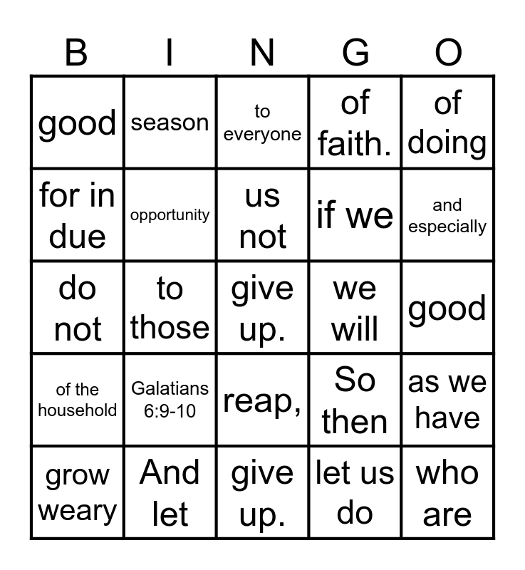 This bingo card has a free space and 24 words: Galatians 6:9-10, And let, us not, grow weary, of doing, good, for in due, season, we will, reap,, if we, do not, So then, as we have, opportunity, let us do, good, to everyone, and especially, to those, who are, of the household, of faith. and give up..