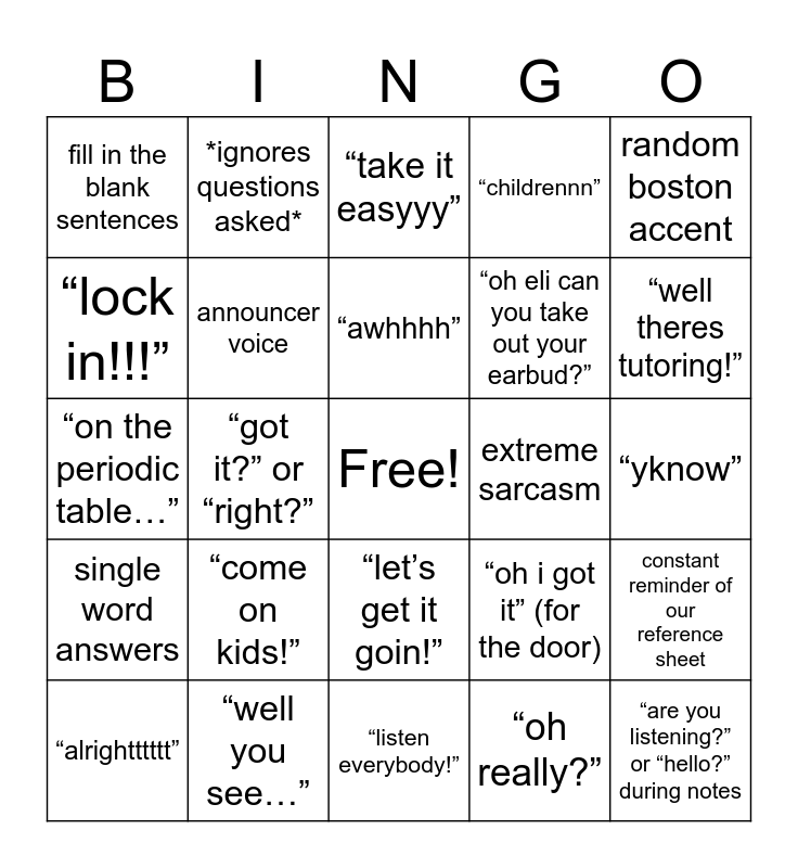 This bingo card has a free space and 24 words: “alrightttttt”, “come on kids!”, “awhhhh”, “oh really?”, random boston accent, fill in the blank sentences, *ignores questions asked*, “take it easyyy”, extreme sarcasm, “yknow”, “on the periodic table…”, announcer voice, “oh i got it” (for the door), constant reminder of our reference sheet, “lock in!!!”, “well you see…”, “listen everybody!”, “childrennn”, “well theres tutoring!”, single word answers, “got it?” or “right?”, “let’s get it goin!”, “oh eli can you take out your earbud?” and “are you listening?” or “hello?” during notes.