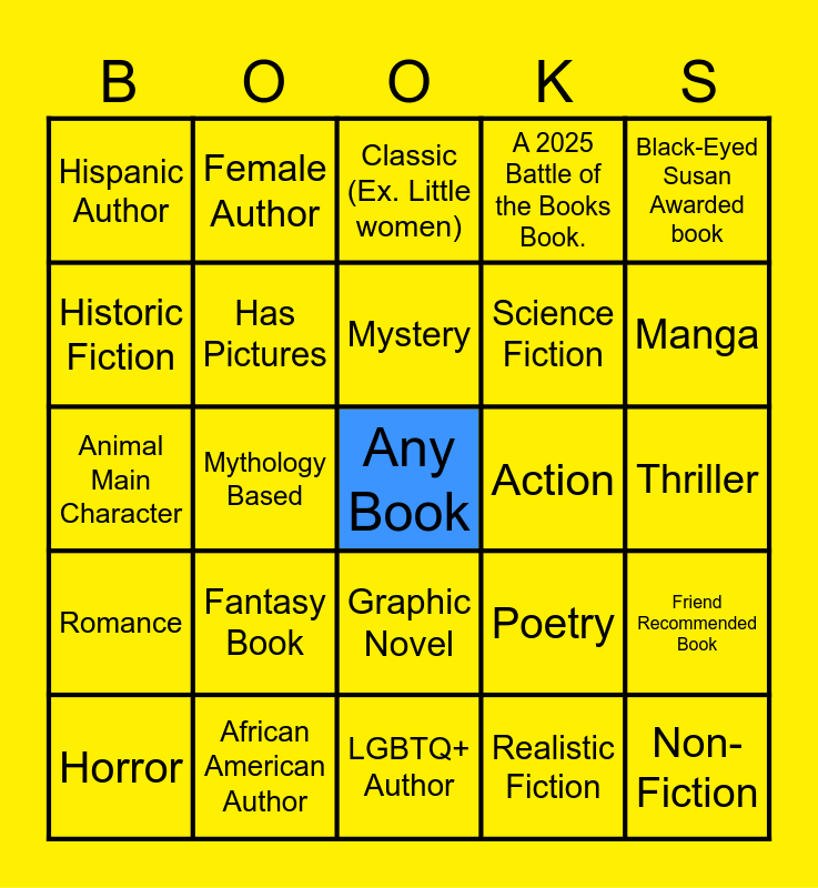 This bingo card has a free space and 24 words: Fantasy Book, African American Author, Mystery, Horror, Black-Eyed Susan Awarded book, Hispanic Author, Historic Fiction, Female Author, Action, Graphic Novel, Science Fiction, Animal Main Character, Poetry, Friend Recommended Book, Has Pictures, Realistic Fiction, Thriller, Classic (Ex. Little women), Manga, Mythology Based, Non-Fiction, Romance, A 2025 Battle of the Books Book. and LGBTQ+ Author.