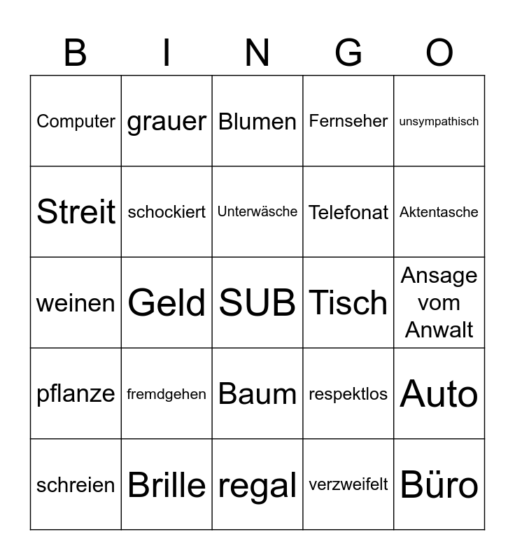 This bingo card has a free space and 24 words: fremdgehen, Brille, Unterwäsche, schreien, unsympathisch, Computer, Streit, grauer, Tisch, Baum, Telefonat, weinen, respektlos, Auto, schockiert, verzweifelt, Ansage vom Anwalt, Blumen, Aktentasche, Geld, Büro, pflanze, Fernseher and regal.