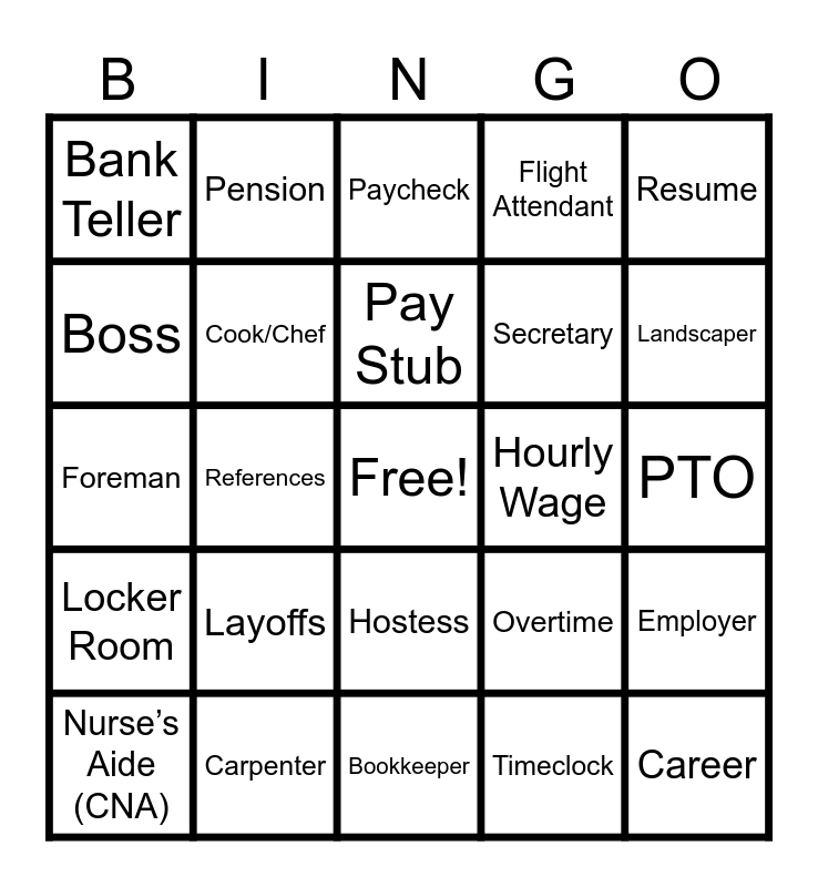 This bingo card has a free space and 55 words: Teacher’s Aide (TA), Nurse’s Aide (CNA), Lab Technician, Bank Teller, Bookkeeper, Cashier, Cook/Chef, Auto Mechanic, Secretary, Pilot, Flight Attendant, Farmer, Veterinarian, Application, Apply, Interview, Resume, References, Job, Career, Hourly Wage, Salary, Overtime, Paycheck, Direct Deposit, Pay Stub, Timeclock, Punch In, PTO, Employer, Raise, Promotion, Human Resources, Manager, Boss, Foreman, Break Room, Locker Room, Income Tax, Social Security, Pension, 401K, Hired, Fired, Layoffs, Carpenter, Plumber, Electrician, Roofer, Landscaper, Store Clerk, Salesperson, Server, Hostess and Bartender.
