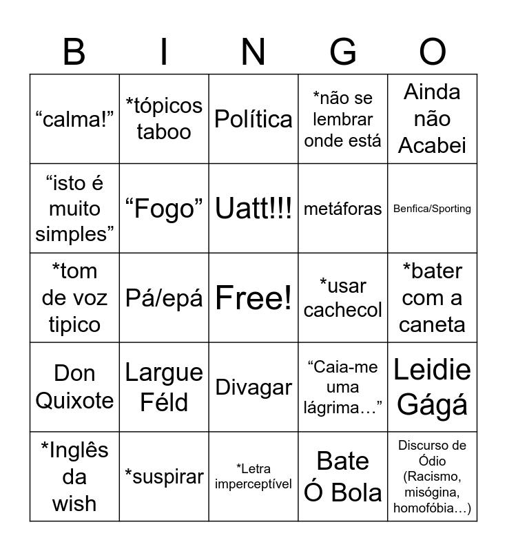 This bingo card has a free space and 42 words: ahhm, Uatt!!!, Uat Eva, Largue Féld, Bate Ó Bola, Leidie Gágá, Discurso de Ódio (Racismo, misógina, homofóbia…), Gosto muito desta…é espetacular, Política, Divagar, *bater com a caneta, Benfica/Sporting, Pá/epá, Ainda não Acabei, “Alguém ouviu o que ele/a disse?”, “Caia-me uma lágrima…”, “Que me caia um raio…”, *tom de voz tipico, *gestos fruity, *tópicos taboo, “isto é muito simples”, “tens de falar mais alto”, *receber chamada a meio da aula, “calma!”, Fátima Lopes, *Falar dos queridos de C.C., metáforas, “perceberam?”, “não podes estar a mandar sms”, Vógue, “Bolas”, Don Quixote, “Fogo”, *Letra imperceptível, Fôtô, *Inglês da wish, *suspirar, *usar cachecol, “shhhhh”, “Pingue Pongue”, *não se lembrar onde está and *balançar o corpo.