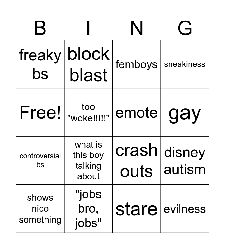 This bingo card has 16 words: "jobs bro, jobs", disney autism, femboys, freaky bs, controversial bs, block blast, crash outs, stare, Free!, too "woke!!!!!", shows nico something, sneakiness, what is this boy talking about, gay, emote and evilness.