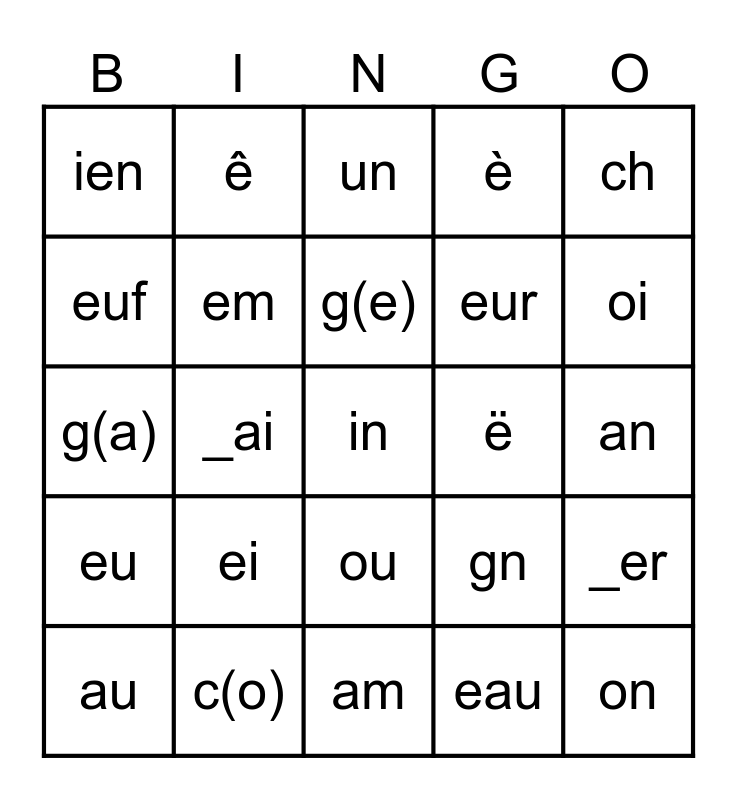 This bingo card has a free space and 31 words: am, om, _ai, t (s), ien, un, em, gn, ë, eau, an, on, en, im, oi, _ez, _er, ei, eu, ou, ch, qu, au, ê, eur, euf, è, g(a), c(o), g(e) and c(i).