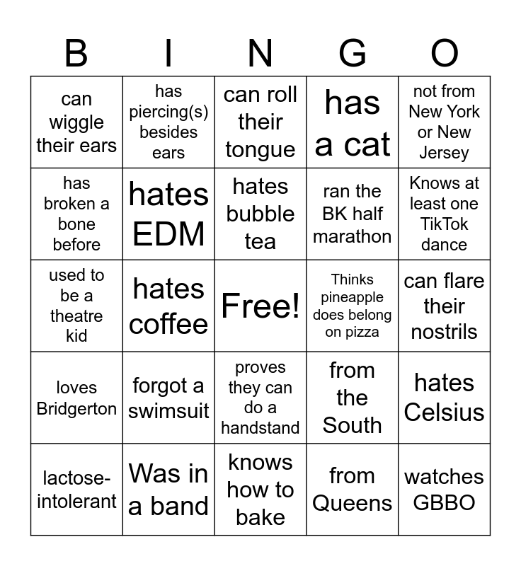 This bingo card has a free space and 34 words: plays soccer, from Queens, plays Hockey, does hip-hop dancing, loves Bridgerton, hates EDM, not from New York or New Jersey, lactose-intolerant, has piercing(s) besides ears, has multiple tattoos, hates bubble tea, can roll their tongue, Has worn socks with sandals unironically, doesn't have a Driver's License, Thinks pineapple does belong on pizza, Knows at least one TikTok dance, Was in a band, used to be a theatre kid, forgot a swimsuit, from the South, proves they can do a handstand, proves they can do a cartwheel, can wiggle their ears, can flare their nostrils, knows how to bake, watches GBBO, has a cat, has a dog, ran the BK half marathon, has broken a bone before, has gotten a new tattoo in residency, hates coffee, hates Celsius and has NEVER vaped.