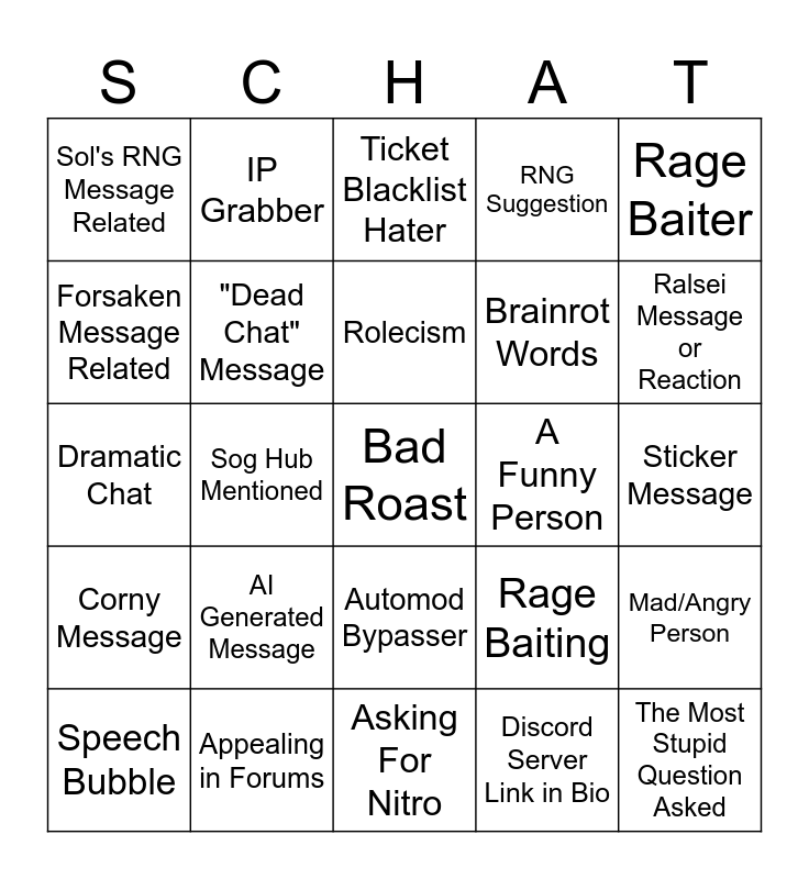 This bingo card has a free space and 24 words: AI Generated Message, Appealing in Forums, Rolecism, Speech Bubble, Rage Baiter, Sol's RNG Message Related, Forsaken Message Related, IP Grabber, A Funny Person, Automod Bypasser, Brainrot Words, Dramatic Chat, Rage Baiting, Mad/Angry Person, "Dead Chat" Message, Discord Server Link in Bio, Sticker Message, Ticket Blacklist Hater, Ralsei Message or Reaction, Sog Hub Mentioned, The Most Stupid Question Asked, Corny Message, RNG Suggestion and Asking For Nitro.