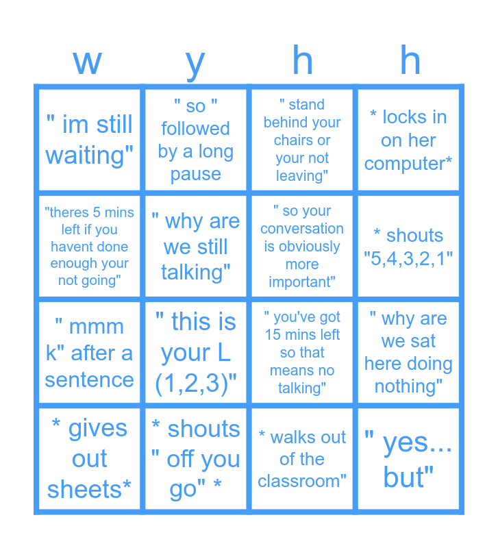 This bingo card has 44 words: "i need a pile of books at the front", * gives out sheets*, " there is a challenge on he board", "sh sh sh sh sh", "im coming round to see what youve done", * has a conversation with the front of the class*, " stand behind your chairs or your not leaving", says "hello ... to answer a question", "theres 5 mins left if you havent done enough your not going", * puts hair in her ponytail but changes her mind", * locks in on her computer*, * shouts " off you go" *, "i know the answers are here because i made this last night from the reading sheet", " your not talking.... still not talking", *organises desk*, " you need to ....", * repeats answers*, " you've got 15 mins left so that means no talking", *puts on america in colour, " this is your L (1,2,3)", " so " followed by a long pause, * says "yes" to answer a question", * drinks water*, " im still waiting", what part of silence do we not understand ", * walks out of the classroom", " sit still", " why are we not writing this down", " im just gonna wait", " yes... but", " we are doing this in silence", " so why are your books closed", " the three of you need to stop", * sets timer*, " why are we sat here doing nothing", * shouts answers ", " im gonna wait cus we are STILL talking", * shouts randomly*, * shouts "5,4,3,2,1", " why are we still talking", " mmm k" after a sentence, " we will just work after 3pm", " so your conversation is obviously more important" and " nice of you to join us ".