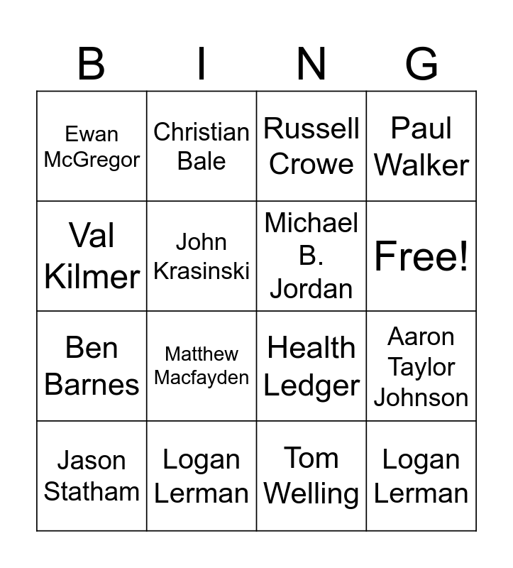 This bingo card has 17 words: Tom Welling, Jason Statham, Russell Crowe, Ewan McGregor, Matthew Macfayden, Paul Walker, Aaron Taylor Johnson, Michael B. Jordan, Free!, John Krasinski, Logan Lerman, Health Ledger, Val Kilmer, Christian Bale, Ben Barnes, Dave Franco and Logan Lerman.