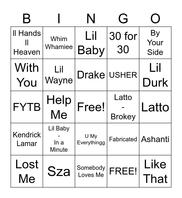 This bingo card has a free space and 25 words: Lil Baby - In a Minute, Somebody Loves Me, Drake, Lost Me, By Your Side, ll Hands ll Heaven, With You, Whim Whamiee, Latto - Brokey, U My Everythingg, USHER, FYTB, Fabricated, Ashanti, Lil Wayne, Dum Dumb Dumber, Latto, Lil Baby, Lil Durk, Help Me, Like That, Sza, Kendrick Lamar, 30 for 30 and FREE!.