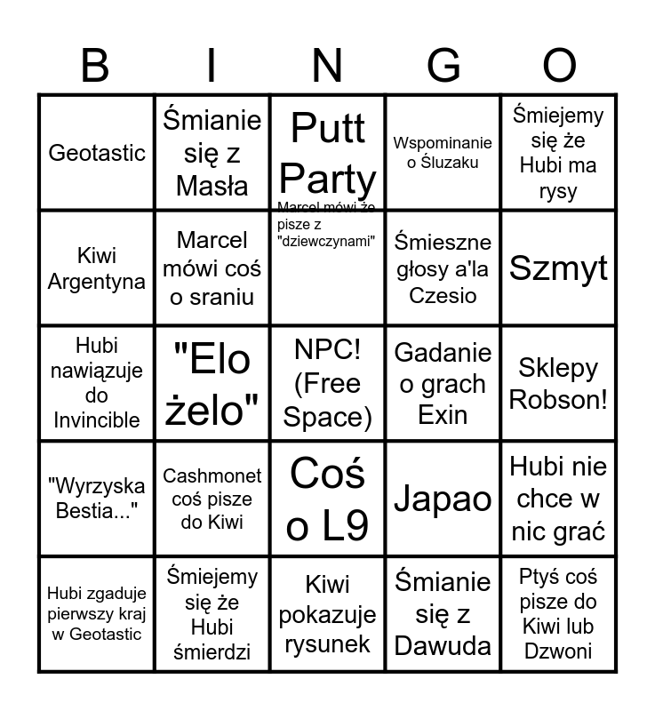 This bingo card has a free space and 70 words: Bandercow!, Sklepy Robson!, Idziemy na Emeralda, Marcel idzie na długiego AFKa, Śmiejemy się że Hubi śmierdzi, Wspominanie o Hindusie, Wspominanie o Śluzaku, Hubi sie wycisza, Śmiejemy się że Hubi ma rysy, Tymek i Hubi coś pierdolą w tle, Hubi nie chce w nic grać, Viggle.ai, Geotastic, Putt Party, Hubi gada o anime, "Elo żelo", Coś o L9, Śmieszne głosy a'la Czesio, Śmianie się z Wyrzyskiej, "Wyrzyska Bestia...", Gadanie o grach Exin, Japao, Szmyt, Markus L., Pan Adam, Bartek Pedofil, Szczekający pies, Śmianie się z Martina, Śmianie się z Dawuda, Wspominanie o Podstawówce, Śmianie się z Masła, Śmianie się z Franka / Pawła, Marcel glejzuje Karola, Gadanie po 2:00 (Głos Huberta), "Hubiego nie było w szkole", Nazywanie Huberta "Jeff" lub "Jefferson", Hubi = Glazurnik, R.E.P.O, Rozmowa o polityce, Kiwi Argentyna, Kiwi gada z gangiem DELTARUNE, Cashmonet coś pisze do Kiwi, Ptyś coś pisze do Kiwi lub Dzwoni, Kiwi idzie po picie/lód/jedzenie, Marcel E-dater, Marcel mówi coś o sraniu, Hubi zgaduje pierwszy kraj w Geotastic, ROBLOX, Nie możemy się zdecydować w co grać, Głos mamy Huberta, Kiwi nie chce gadać bo sie uczy, Hubi i Marcel mają beef, Hubi jest agresywny bez powodu, Kiwi coś gada o rdzennych amerykanach, Kiwi pokazuje rysunek, Kiwi gada o DELTARUNE, Marcel mówi że pisze z "dziewczynami", Śmianie się z Olka / Fembojów, Śmianie się z Wojtka W., Szalone Eskapady Henryka i Heleny, Hubi nawiązuje do Invincible, Marcel wysyła stare memy, Humor Spermiarski, TikTok Brainrot, LGBTQ+ Among Us Gif, Marcel ragebaituje Kiwi prawackimi rzeczami, Śmianie się z Krzysia, League of Legends / Valorant nawiązanie, Gadanie o dziewczynach z podstawówki and Gadanie o Pani Marlence.