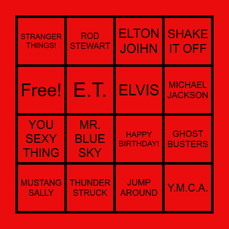 This bingo card has 16 words: THUNDER STRUCK, GHOST BUSTERS, ELTON JOIHN, STRANGER THINGS!, YOU SEXY THING, ROD STEWART, HAPPY BIRTHDAY!, JUMP AROUND, Free!, E.T., MUSTANG SALLY, SHAKE IT OFF, MR. BLUE SKY, MICHAEL JACKSON, ELVIS and Y.M.C.A..