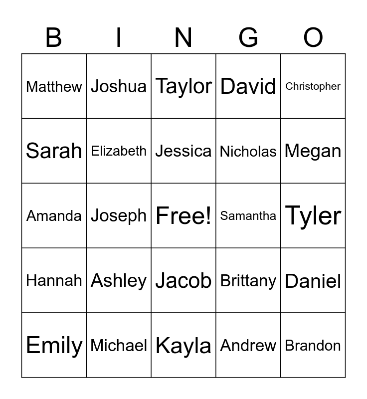 This bingo card has a free space and 24 words: Ashley, Michael, Jessica, Emily, Christopher, Matthew, Sarah, Joshua, Samantha, Jacob, Nicholas, Amanda, Brittany, Daniel, Elizabeth, Andrew, Tyler, Taylor, Megan, Joseph, Brandon, Hannah, David and Kayla.