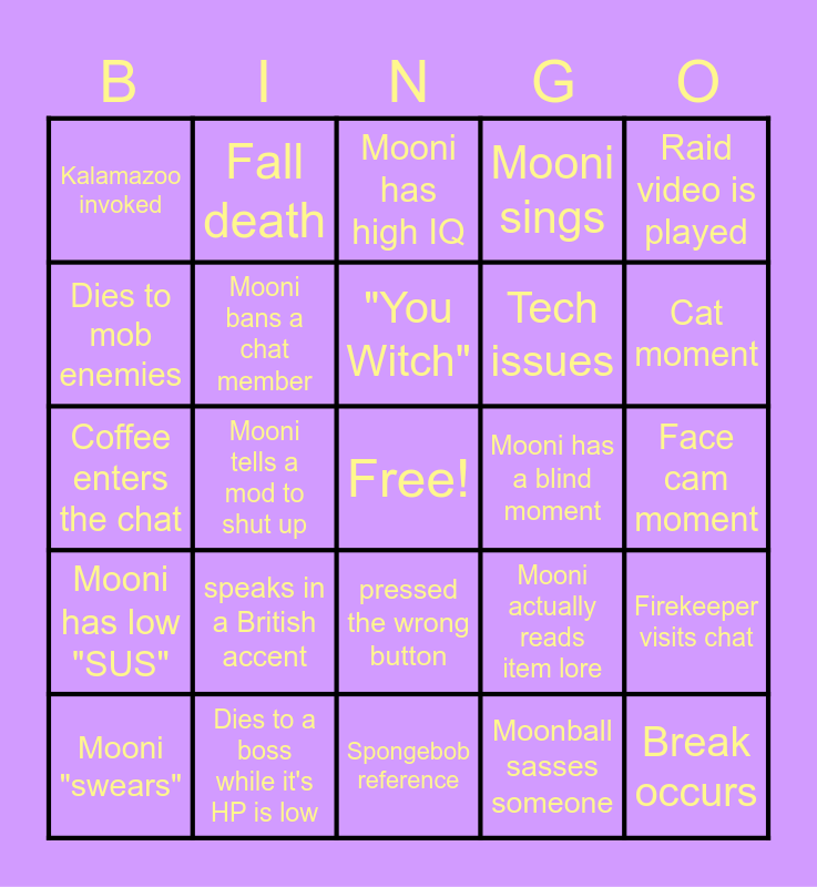 This bingo card has a free space and 24 words: speaks in a British accent, Dies to a boss while it's HP is low, "You Witch", Mooni "swears", Raid video is played, Kalamazoo invoked, Dies to mob enemies, Fall death, Mooni has a blind moment, pressed the wrong button, Tech issues, Coffee enters the chat, Mooni actually reads item lore, Firekeeper visits chat, Mooni bans a chat member, Moonball sasses someone, Face cam moment, Mooni has high IQ, Cat moment, Mooni tells a mod to shut up, Break occurs, Mooni has low "SUS", Mooni sings and Spongebob reference.