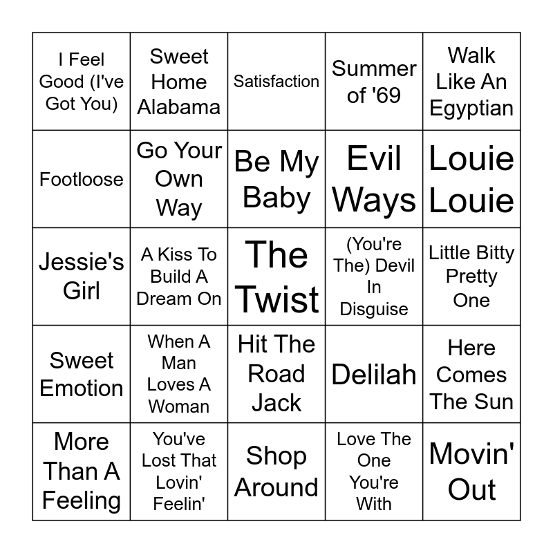 This bingo card has 90 words: Runaround Sue, Personality, Hit The Road Jack, Only The Good Die Young, Copacabana, Raindrops Keep Fallin' On My Head, Another Saturday Night, California Girls, Can't Help Falling In Love, Lights, Hot Stuff, Good Golly Miss Molly, Brick House, Little Bitty Pretty One, I Can See Clearly Now, Be My Baby, O-o-h Child, Rockin' Robin, Love Potion No. 9, Private Eyes, Do You Believe In Magic, Lollipop, Shop Around, The Joker, Jessie's Girl, You've Lost That Lovin' Feelin', Cracklin' Rosie, Luck Be A Lady, I Walk The Line, Hey Baby, Escape, Here Comes The Sun, Love Shack, Sweet Emotion, I Feel Good (I've Got You), Summer of '69, Satisfaction, Wonderful Tonight, A Kiss To Build A Dream On, Louie Louie, More Than A Feeling, Footloose, Signed, Sealed, Delivered (I'm Yours), On The Way To Cape May, (They Long To Be) Close To You, Delilah, Travelin' Man, Dance To The Music, Sea Cruise, Sixteen Tons, Thank God I'm A Country Boy, Evil Ways, Maybe I'm Amazed, Volare, Jolene, He's A Rebel, (You're The) Devil In Disguise, Material Girl, I Only Have Eyes For You, Funkytown, Last Dance, Ain't No Sunshine (When She's Gone), My Girl, Will You Love Me Tomorrow, Who Put The Bomp, In The Still Of The Night, Bad, Bad Leroy Brown, Love The One You're With, Everybody Have Fun Tonight, Eye of the Tiger, When A Man Loves A Woman, The Twist, The Way You Do The Things You Do, (I've Had) The Time Of My Life, Sweet Home Alabama, Go Your Own Way, Summertime Blues, Peggy Sue, Ladies Night, The Boys Are Back In Town, Movin' Out, Walk Like An Egyptian, Glory Days, Celebration, Breaking Up Is Hard To Do, You Shook Me All Night Long, Kiss, Africa, Wake Up Little Suzie and Blue Moon.