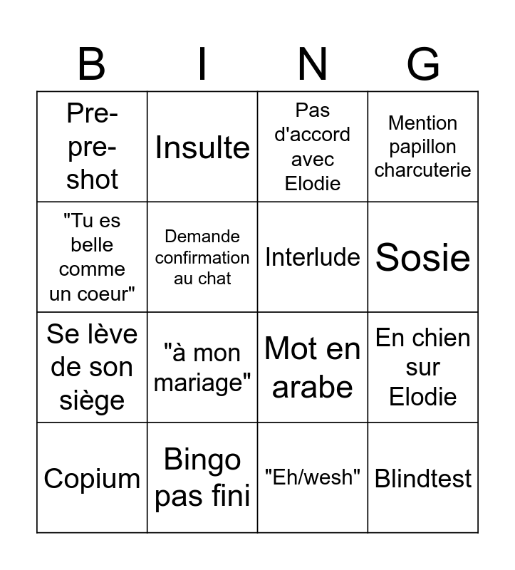 This bingo card has 16 words: Bingo pas fini, En chien sur Elodie, Pas d'accord avec Elodie, Pre-pre-shot, Se lève de son siège, Insulte, Mot en arabe, "Eh/wesh", "Tu es belle comme un coeur", Demande confirmation au chat, Copium, Mention papillon charcuterie, "à mon mariage", Sosie, Interlude and Blindtest.