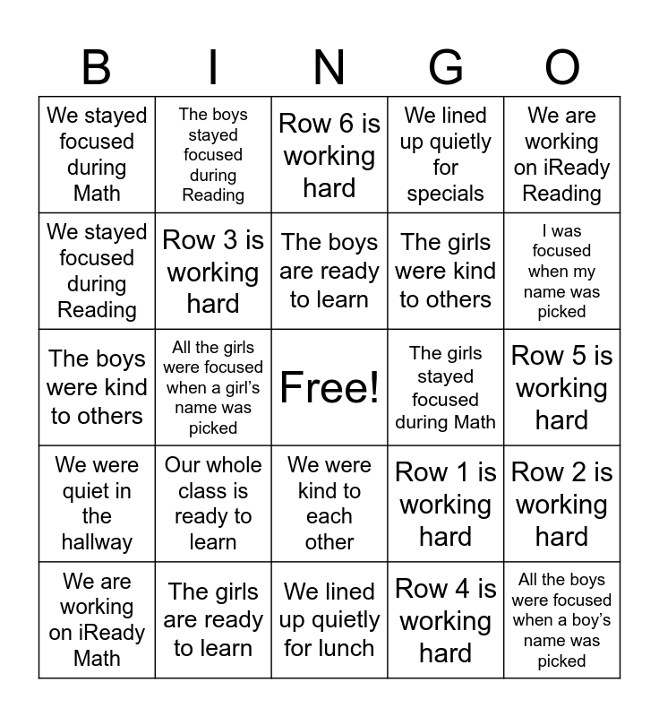 This bingo card has a free space and 24 words: Our whole class is ready to learn, The girls are ready to learn, The boys are ready to learn, We are working on iReady Math, We are working on iReady Reading, We stayed focused during Math, We stayed focused during Reading, The boys stayed focused during Reading, The girls stayed focused during Math, We were kind to each other, The girls were kind to others, The boys were kind to others, Row 1 is working hard, Row 2 is working hard, Row 3 is working hard, Row 4 is working hard, Row 5 is working hard, Row 6 is working hard, I was focused when my name was picked, All the girls were focused when a girl’s name was picked, All the boys were focused when a boy’s name was picked, We were quiet in the hallway, We lined up quietly for specials and We lined up quietly for lunch.