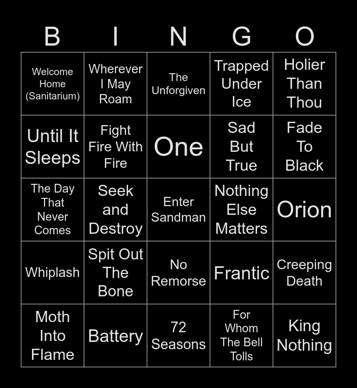 This bingo card has a free space and 29 words: Fuel, Battery, The Unforgiven, Harvester of Sorrow, Holier Than Thou, Welcome Home (Sanitarium), Fight Fire With Fire, One, Nothing Else Matters, Creeping Death, Moth Into Flame, Seek and Destroy, For Whom The Bell Tolls, King Nothing, The Day That Never Comes, Hit The Lights, 72 Seasons, Frantic, Fade To Black, Whiplash, Spit Out The Bone, Master of Puppets, Sad But True, Orion, Until It Sleeps, Wherever I May Roam, No Remorse, Trapped Under Ice and Through The Never.
