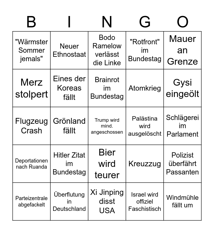 This bingo card has a free space and 24 words: Hitler Zitat im Bundestag, Überflutung in Deutschland, Brainrot im Bundestag, Parteizentrale abgefackelt, Mauer an Grenze, "Wärmster Sommer jemals", Merz stolpert, Neuer Ethnostaat, Palästina wird ausgelöscht, Bier wird teurer, Atomkrieg, Flugzeug Crash, Kreuzzug, Polizist überfährt Passanten, Eines der Koreas fällt, Israel wird offiziel Faschistisch, Schlägerei im Parlament, Bodo Ramelow verlässt die Linke, Gysi eingeölt, Grönland fällt, Windmühle fällt um, Deportationen nach Ruanda, "Rotfront" im Bundestag and Xi Jinping disst USA.