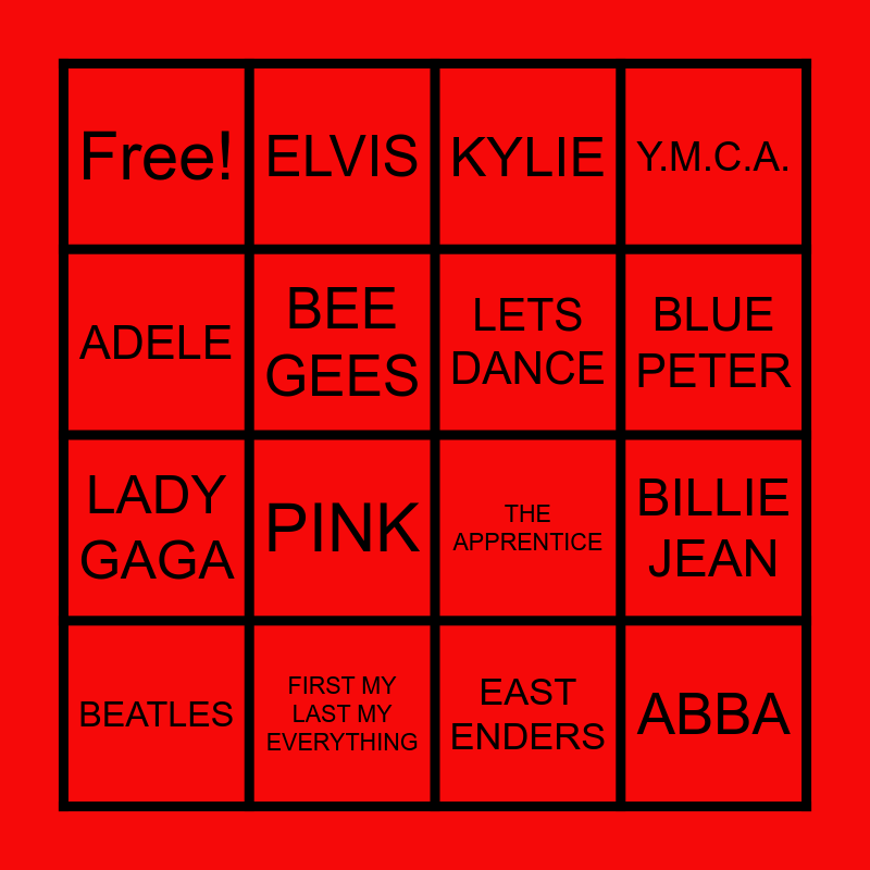 This bingo card has 16 words: BEATLES, FIRST MY LAST MY EVERYTHING, KYLIE, Y.M.C.A., ADELE, ELVIS, THE APPRENTICE, BILLIE JEAN, Free!, BEE GEES, EAST ENDERS, BLUE PETER, LADY GAGA, PINK, LETS DANCE and ABBA.