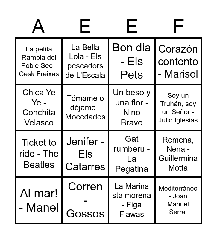 This bingo card has 45 words: Alegria - Antònia Font, Al mar! - Manel, Bicicletes - Blaumut, Bienvenidos - Miguel Ríos, Black is black - Los Bravos, Boig per tu - Sau, Bon dia - Els Pets, Camins - Sopa de Cabra, Chica Ye Ye - Conchita Velasco, Chiquitita - ABBA, Corazón contento - Marisol, Corren - Gossos, Coti x Coti - The Tyets, Doraemon - SX3 (Club Súper 3), Escriurem - Miki Núñez, Estimar-te com la terra - Ginestà, Festa major - La Trinca, Gat rumberu - La Pegatina, Hay que venir al sur - Raffaella Carrà, Jenifer - Els Catarres, La Bella Lola - Els pescadors de L'Escala, La Farola, la Farola - Miquel del Roig, La moto - Pere Tapias, La petita Rambla del Poble Sec - Cesk Freixas, La revolución sexual - La Casa Azul, La Marina sta morena - Figa Flawas, L'Empordà - Sopa De Cabra, Llença't - Lax'n'Busto, Mamma Mia - ABBA, Mediterráneo - Joan Manuel Serrat, Mi gran noche - Raphael, New York, New York - Frank Sinatra, Tony Bennett, No ve d'un pam - La Trinca, Qualsevol nit pot sortir el sol - Sisa, Quince años tiene mi amor - Duo Dinamico, Remena, Nena - Guillermina Motta, Rock with You - Michael Jackson, Sense tu - Teràpia de Shock, Serem ocells - Oques Grasses, Soy un Truhán, soy un Señor - Julio Iglesias, Tómame o déjame - Mocedades, Ticket to ride - The Beatles, Una lluna a l'aigua - Txarango, Un beso y una flor - Nino Bravo and Yellow Submarine - The Beatles.