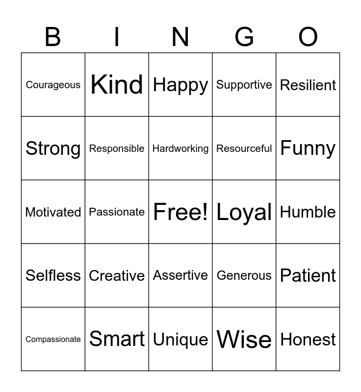 This bingo card has a free space and 24 words: Creative, Smart, Hardworking, Compassionate, Resilient, Courageous, Strong, Kind, Loyal, Assertive, Resourceful, Motivated, Generous, Patient, Responsible, Wise, Humble, Happy, Funny, Passionate, Honest, Selfless, Supportive and Unique.