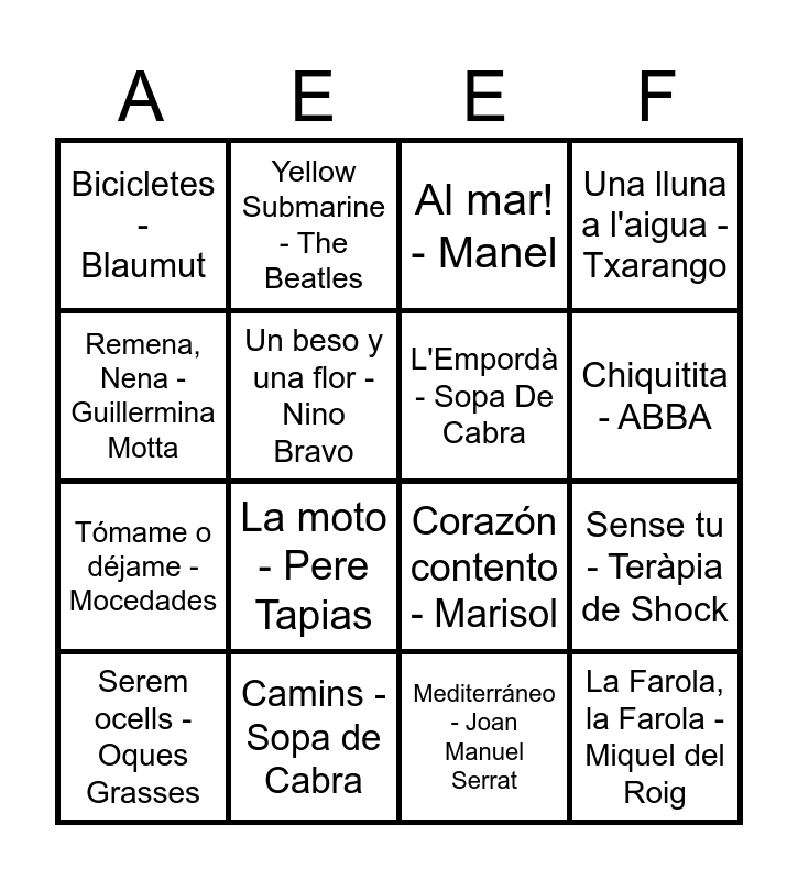 This bingo card has 45 words: La revolución sexual - La Casa Azul, Serem ocells - Oques Grasses, Llença't - Lax'n'Busto, Soy un Truhán, soy un Señor - Julio Iglesias, Mamma Mia - ABBA, Estimar-te com la terra - Ginestà, Al mar! - Manel, No ve d'un pam - La Trinca, Remena, Nena - Guillermina Motta, Boig per tu - Sau, Una lluna a l'aigua - Txarango, Camins - Sopa de Cabra, Black is black - Los Bravos, Ticket to ride - The Beatles, Rock with You - Michael Jackson, Mi gran noche - Raphael, Bienvenidos - Miguel Ríos, Corazón contento - Marisol, La Marina sta morena - Figa Flawas, La moto - Pere Tapias, Yellow Submarine - The Beatles, Quince años tiene mi amor - Duo Dinamico, Qualsevol nit pot sortir el sol - Sisa, Bicicletes - Blaumut, Festa major - La Trinca, Mediterráneo - Joan Manuel Serrat, Bon dia - Els Pets, Escriurem - Miki Núñez, Corren - Gossos, La Farola, la Farola - Miquel del Roig, Gat rumberu - La Pegatina, Jenifer - Els Catarres, Hay que venir al sur - Raffaella Carrà, New York, New York - Frank Sinatra, Tony Bennett, Coti x Coti - The Tyets, Sense tu - Teràpia de Shock, La petita Rambla del Poble Sec - Cesk Freixas, Chica Ye Ye - Conchita Velasco, La Bella Lola - Els pescadors de L'Escala, Chiquitita - ABBA, Un beso y una flor - Nino Bravo, Tómame o déjame - Mocedades, Doraemon - SX3 (Club Súper 3), L'Empordà - Sopa De Cabra and Alegria - Antònia Font.