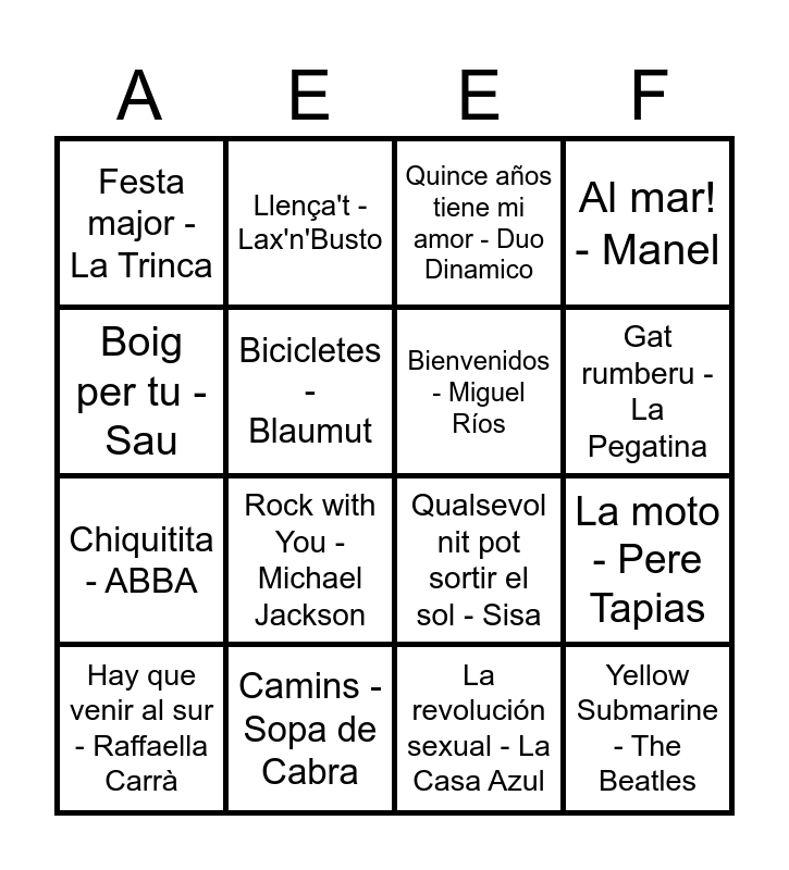 This bingo card has 45 words: La Farola, la Farola - Miquel del Roig, Hay que venir al sur - Raffaella Carrà, Coti x Coti - The Tyets, Corazón contento - Marisol, Mi gran noche - Raphael, La petita Rambla del Poble Sec - Cesk Freixas, Quince años tiene mi amor - Duo Dinamico, No ve d'un pam - La Trinca, Boig per tu - Sau, Escriurem - Miki Núñez, Al mar! - Manel, Camins - Sopa de Cabra, Black is black - Los Bravos, Bon dia - Els Pets, Serem ocells - Oques Grasses, Estimar-te com la terra - Ginestà, L'Empordà - Sopa De Cabra, Qualsevol nit pot sortir el sol - Sisa, Alegria - Antònia Font, Rock with You - Michael Jackson, Llença't - Lax'n'Busto, Doraemon - SX3 (Club Súper 3), Corren - Gossos, Festa major - La Trinca, New York, New York - Frank Sinatra, Tony Bennett, La revolución sexual - La Casa Azul, Mediterráneo - Joan Manuel Serrat, Una lluna a l'aigua - Txarango, Mamma Mia - ABBA, Yellow Submarine - The Beatles, Un beso y una flor - Nino Bravo, Chica Ye Ye - Conchita Velasco, Ticket to ride - The Beatles, Remena, Nena - Guillermina Motta, La Marina sta morena - Figa Flawas, La moto - Pere Tapias, Jenifer - Els Catarres, Sense tu - Teràpia de Shock, Soy un Truhán, soy un Señor - Julio Iglesias, Gat rumberu - La Pegatina, Bicicletes - Blaumut, Chiquitita - ABBA, La Bella Lola - Els pescadors de L'Escala, Bienvenidos - Miguel Ríos and Tómame o déjame - Mocedades.