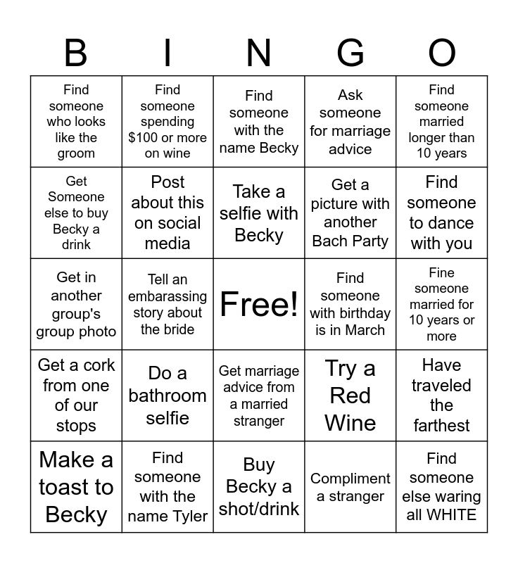 This bingo card has a free space and 27 words: Try a Red Wine, Try a White Wine, Get a picture with another Bach Party, Buy Becky a shot/drink, Get Someone else to buy Becky a drink, Find someone with the name Becky, Find someone spending $100 or more on wine, Get a cork from one of our stops, Find someone with birthday is in March, Have traveled the farthest, Get in another group's group photo, Ask someone for marriage advice, Make a toast to Becky, Find someone with the name Tyler, Find someone to dance with you, Dance by yourself, Post about this on social media, Take a selfie with Becky, Do a bathroom selfie, Find someone who looks like the groom, Fine someone married for 10 years or more, Compliment a stranger, Tell an embarassing story about the bride, Find someone else waring all WHITE, Get marriage advice from a married stranger, Find someone married longer than 10 years and Find someone wearing blue.