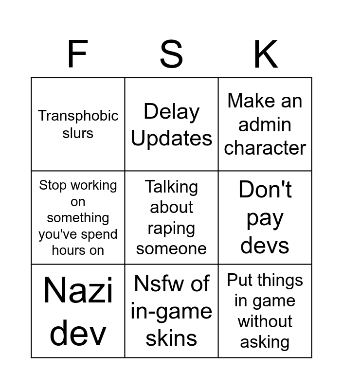 This bingo card has a free space and 8 words: Don't pay devs, Make an admin character, Delay Updates, Nazi dev, Transphobic slurs, Put things in game without asking, Stop working on something you've spend hours on and Nsfw of in-game skins.