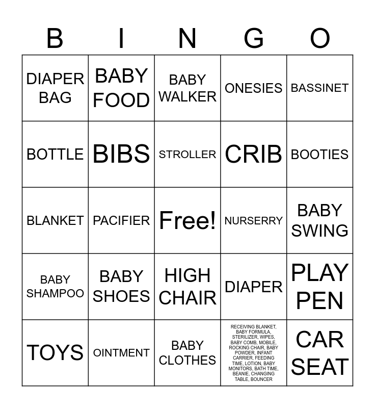 This bingo card has a free space and 25 words: BABY SHOES, BABY CLOTHES, STROLLER, TOYS, BASSINET, DIAPER BAG, BOTTLE, BABY FOOD, NURSERRY, HIGH CHAIR, CRIB, BLANKET, DIAPER, PLAY PEN, BIBS, LULLABY, BABY SWING, BABY WALKER, BOOTIES, PACIFIER, CAR SEAT, OINTMENT, BABY SHAMPOO, ONESIES and RECEIVING BLANKET, BABY FORMULA, STERILIZER, WIPES, BABY COMB, MOBILE, ROCKING CHAIR, BABY POWDER, INFANT CARRIER, FEEDING TIME, LOTION, BABY MONITORS, BATH TIME, BEANIE, CHANGING TABLE, BOUNCER.
