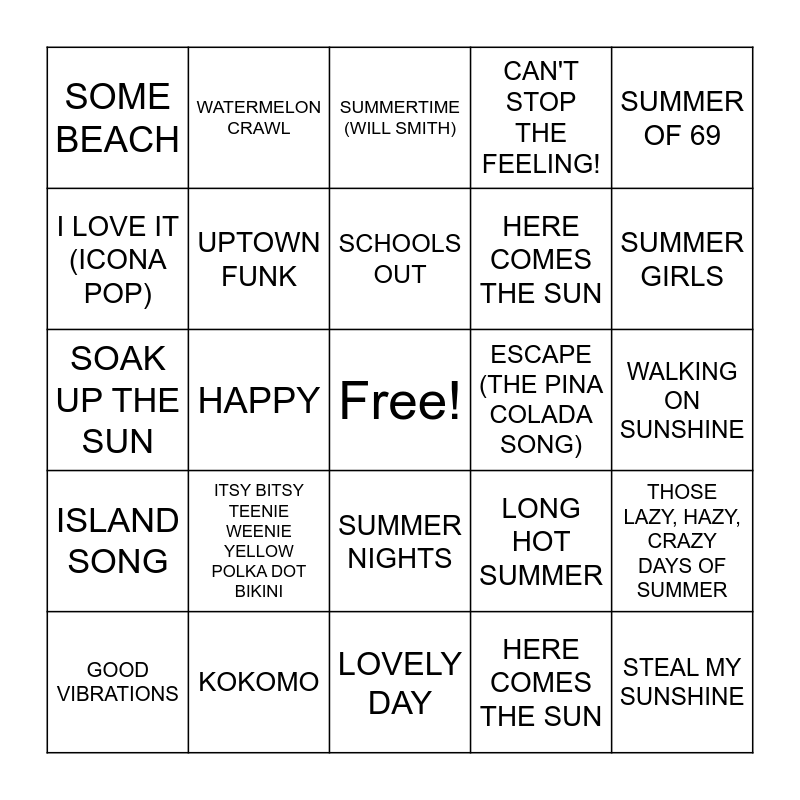 This bingo card has a free space and 43 words: CALIFORNIA GIRLS (KATY PERRY), STEAL MY SUNSHINE, THE TIDE IS HIGH, GOOD VIBRATIONS, IN THE SUMMERTIME, HERE COMES THE SUN, SUMMERTIME (WILL SMITH), LOW RIDER, SUMMER OF 69, KOKOMO, CAN'T STOP THE FEELING!, ESCAPE (THE PINA COLADA SONG), SUMMER NIGHTS, ITSY BITSY TEENIE WEENIE YELLOW POLKA DOT BIKINI, SURFIN’ USA, LOVELY DAY, ALL SUMMER LONG, SOAK UP THE SUN, ISLAND IN THE SUN, SUMMER GIRLS, WATERMELON CRAWL, SUMMERTIME BLUES, SUMMERTIME (KENNY CHESNEY), SOME BEACH, CHICKEN FRIED, WALKING ON SUNSHINE, SUMMER, COOL FOR THE SUMMER, LONG HOT SUMMER, ISLAND SONG, SUN DAZE, THOSE LAZY, HAZY, CRAZY DAYS OF SUMMER, SHAKE IT OFF, HAPPY, CALIFORNIA GIRLS (KATIE PERRY), BANANA BOAT (DAY-O), HOT FUN IN THE SUMMERTIME, SCHOOLS OUT, I LOVE IT (ICONA POP), HERE COMES THE SUN, SURFIN USA, UPTOWN FUNK and ONE LOVE.