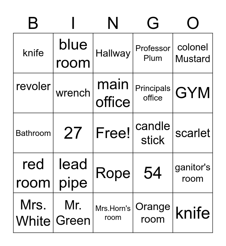 This bingo card has a free space and 24 words: Mrs. White, lead pipe, main office, Orange room, colonel Mustard, knife, blue room, Hallway, candle stick, scarlet, Bathroom, wrench, 54, ganitor's room, revoler, Mr. Green, Mrs.Horn's room, Professor Plum, GYM, red room, 27, Rope, Principals office and knife.