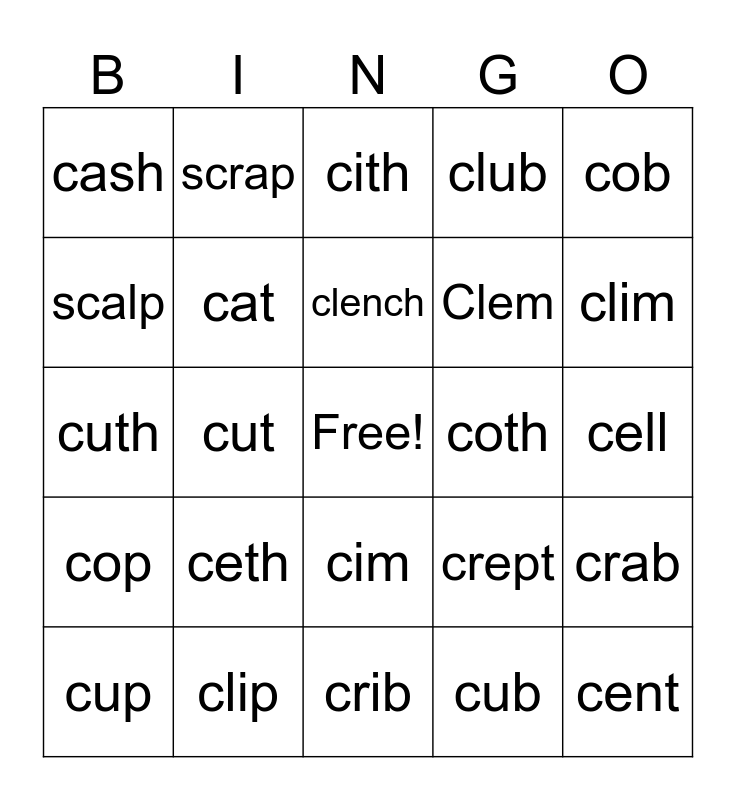 This bingo card has a free space and 29 words: cup, cinch, cut, clap, cash, cith, cat, ceth, coth, clip, cell, cent, crib, cub, clim, scram, cim, cop, cob, cuth, crept, clam, Clem, scalp, club, scrap, crab, clench and crab.