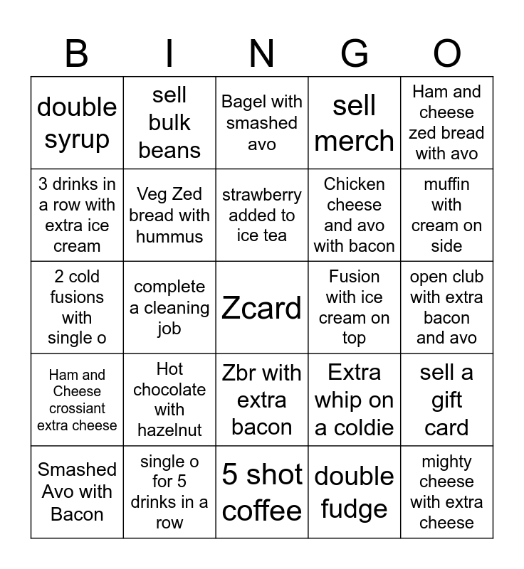 This bingo card has a free space and 29 words: Smashed Avo with Bacon, Fudge in an iced latte, complete a cleaning job, sell 2 slices of raisin toast, double syrup, Bagel with smashed avo, Veg Zed bread with hummus, Hot chocolate with hazelnut, Fusion with ice cream on top, single o for 5 drinks in a row, open club with extra bacon and avo, mighty cheese with extra cheese, 5 shot coffee, double fudge, muffin with cream on side, babychino and a cookie, Zbr with extra bacon, Ham and Cheese crossiant extra cheese, Ham and cheese zed bread with avo, 2 cold fusions with single o, Extra whip on a coldie, Le Crunch with cheese, Chicken cheese and avo with bacon, 3 drinks in a row with extra ice cream, sell merch, sell bulk beans, sell a gift card, strawberry added to ice tea and strawberry foam on iced matcha.