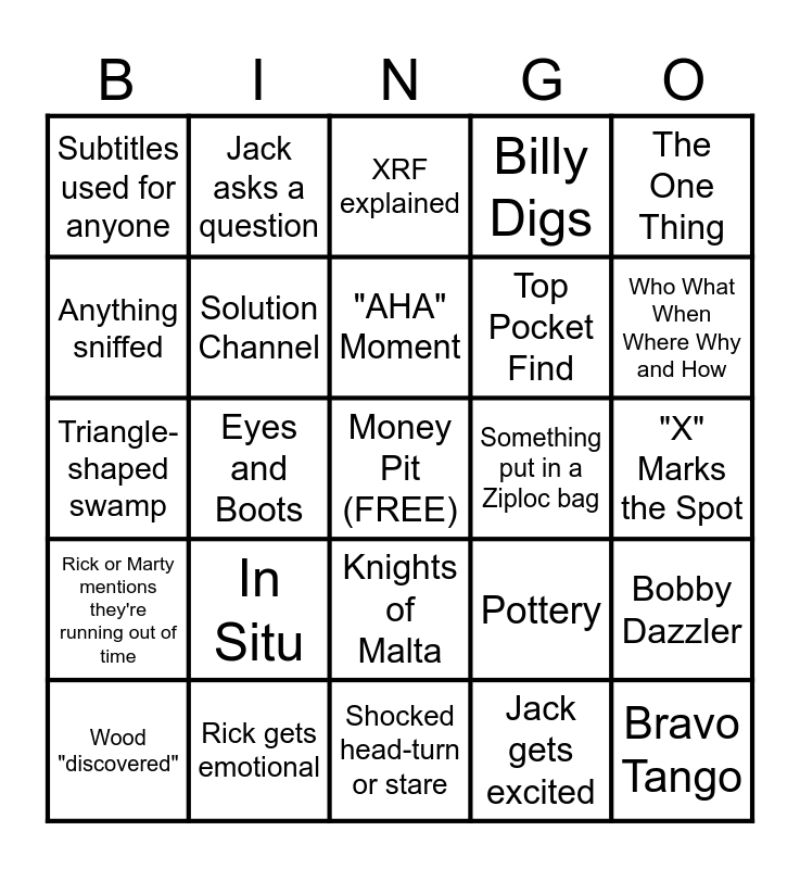 This bingo card has a free space and 24 words: In Situ, Rick gets emotional, "AHA" Moment, Wood "discovered", The One Thing, Subtitles used for anyone, Anything sniffed, Jack asks a question, Something put in a Ziploc bag, Knights of Malta, Top Pocket Find, Triangle-shaped swamp, Pottery, Bobby Dazzler, Solution Channel, Jack gets excited, "X" Marks the Spot, XRF explained, Who What When Where Why and How, Eyes and Boots, Bravo Tango, Rick or Marty mentions they're running out of time, Billy Digs and Shocked head-turn or stare.