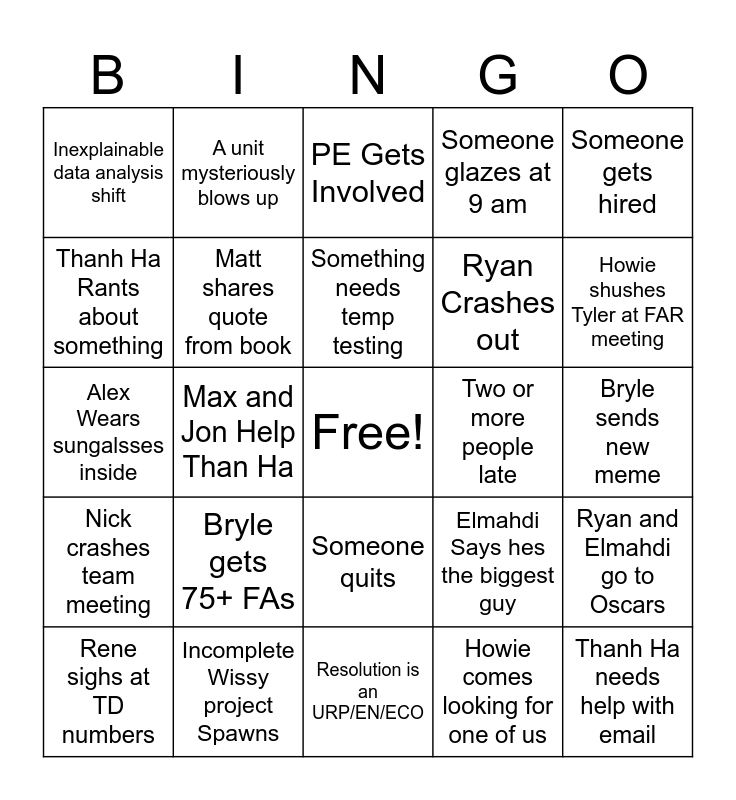 This bingo card has a free space and 27 words: Elmahdi Says hes the biggest guy, Aziz quotes DJ Khalid, Ryan Crashes out, Resolution is an URP/EN/ECO, Thanh Ha Rants about something, PE Gets Involved, A unit mysteriously blows up, Nick crashes team meeting, Two or more people late, Ryan and Elmahdi go to Oscars, Alex Wears sungalsses inside, Someone glazes at 9 am, Rene sighs at TD numbers, Incomplete Wissy project Spawns, Howie shushes Tyler at FAR meeting, 3 Units fail in a row on NHR, Matt shares quote from book, Something needs temp testing, Bryle gets 75+ FAs, Inexplainable data analysis shift, Bryle sends new meme, Howie comes looking for one of us, Max and Jon Help Than Ha, Thanh Ha needs help with email, Someone quits, Someone gets hired and Rene out majority of week.