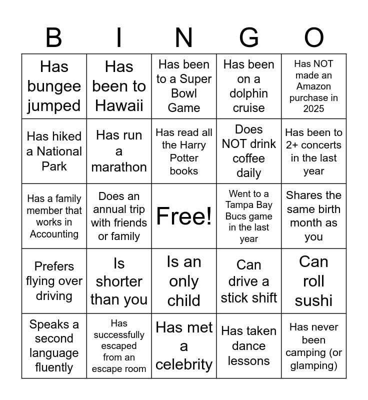 This bingo card has a free space and 29 words: Speaks a second language fluently, Has never been on an airplane, Does an annual trip with friends or family, Has been skydiving, Has bungee jumped, Has been to a Super Bowl Game, Has run a marathon, Is shorter than you, Went to a Tampa Bay Bucs game in the last year, Has successfully escaped from an escape room, Shares the same birth month as you, Has never been camping (or glamping), Has met a celebrity, Has taken dance lessons, Has been to 2+ concerts in the last year, Has moved in the last year, Is an only child, Prefers flying over driving, Has NOT made an Amazon purchase in 2025, Has a family member that works in Accounting, Can drive a stick shift, Has never received a speeding ticket, Does NOT drink coffee daily, Has hiked a National Park, Has been on a dolphin cruise, Has been to Hawaii, Can roll sushi, Has read all the Harry Potter books and Typically wakes up before 5am.