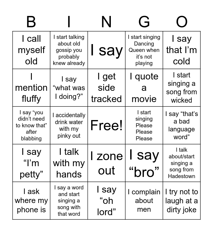 This bingo card has a free space and 29 words: I ask where my phone is, I mention one of my celebrity crushes, I accidentally drink water with my pinky out, I say “oh goodness”, I call myself old, I say, I say “what was I doing?”, I talk with my hands, I start singing Please Please Please, I say a word and start singing a song with that word, I say “that’s a bad language word”, I try not to laugh at a dirty joke, I say “oh lord”, I complain about men, I start singing a song from wicked, I say “you suck”, I zone out, I say “I’m petty”, I say that I’m cold, I say “you didn’t need to know that” after blabbing, I say “bro”, I complain about people at my school, I quote a movie, I mention fluffy, I start singing Dancing Queen when it’s not playing, I start talking about old gossip you probably knew already, I talk about/start singing a song from Hadestown, I get side tracked and I mention I saw Jordan Fisher IRL.