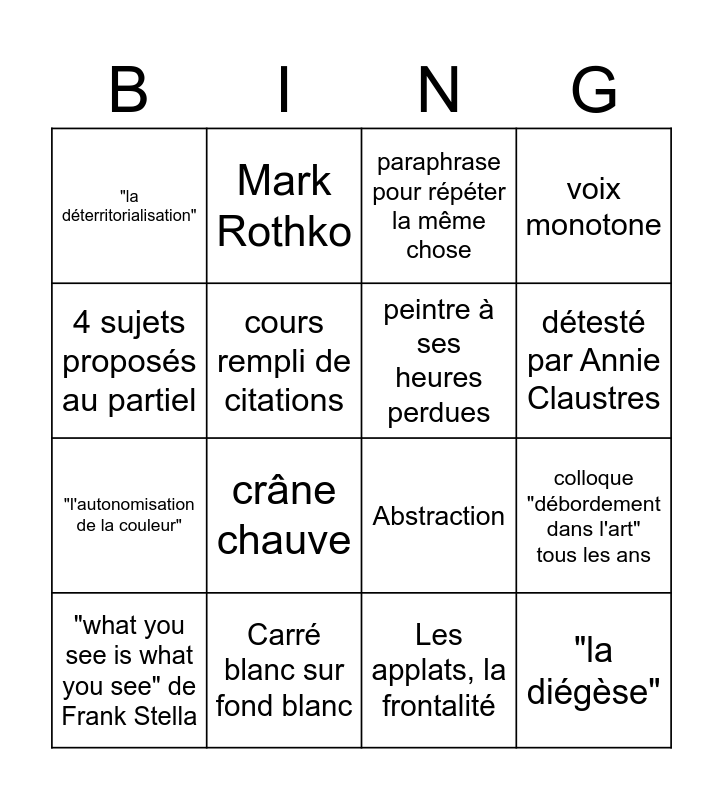 This bingo card has 16 words: Carré blanc sur fond blanc, colloque "débordement dans l'art" tous les ans, paraphrase pour répéter la même chose, "la déterritorialisation", "l'autonomisation de la couleur", Mark Rothko, Abstraction, Les applats, la frontalité, 4 sujets proposés au partiel, cours rempli de citations, "what you see is what you see" de Frank Stella, voix monotone, crâne chauve, détesté par Annie Claustres, peintre à ses heures perdues and "la diégèse".