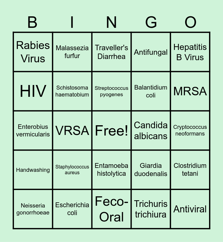 This bingo card has a free space and 24 words: Staphylococcus aureus, Escherichia coli, Streptococcus pyogenes, Neisseria gonorrhoeae, Hepatitis B Virus, Rabies Virus, HIV, Malassezia furfur, Candida albicans, Entamoeba histolytica, Balantidium coli, Enterobius vermicularis, Giardia duodenalis, Clostridium tetani, Schistosoma haematobium, Trichuris trichiura, Cryptococcus neoformans, Traveller's Diarrhea, MRSA, VRSA, Antiviral, Handwashing, Antifungal and Feco-Oral.