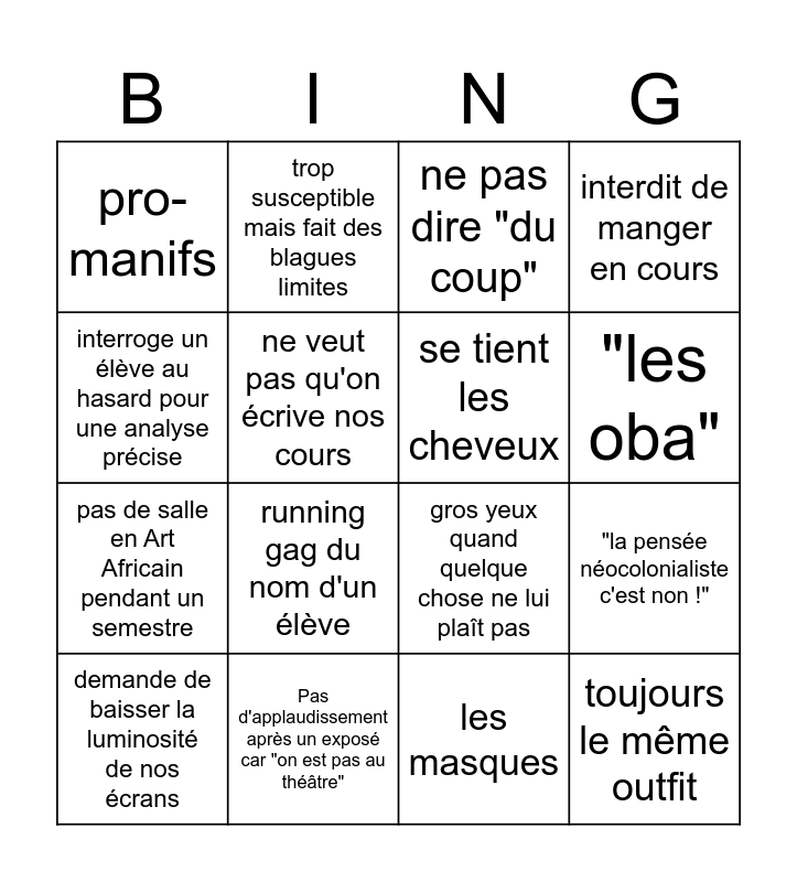 This bingo card has 16 words: Pas d'applaudissement après un exposé car "on est pas au théâtre", "la pensée néocolonialiste c'est non !", ne pas dire "du coup", pro-manifs, pas de salle en Art Africain pendant un semestre, trop susceptible mais fait des blagues limites, gros yeux quand quelque chose ne lui plaît pas, les masques, interroge un élève au hasard pour une analyse précise, ne veut pas qu'on écrive nos cours, demande de baisser la luminosité de nos écrans, interdit de manger en cours, running gag du nom d'un élève, "les oba", se tient les cheveux and toujours le même outfit.
