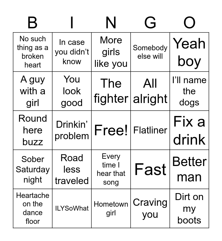 This bingo card has a free space and 50 words: Body like a back road, Dirt on my boots, Hurricane, Hometown girl, Road less traveled, My girl, In case you didn’t know, Do I make you wanna, A guy with a girl, How not to, You look good, Somebody else will, Better man, Fast, If I told you, Any ol’ barstool, The fighter, Flatliner, Think a little less, Yeah boy, Drinkin’ problem, Craving you, No such thing as a broken heart, All alright, Black, Small town boy, I’ll name the dogs, It ain’t my fault, More girls like you, Every time I hear that song, The weekend, When it rains it pours, Star of the show, God,your mama, and me, ILYSoWhat, Seeing’ red, Every little thing, All on me, What ifs, Fix a drink, Wild West, May we all, All the pretty girls, For her, Heartache on the dance floor, Round here buzz, Broken halos, Life goes on, Sober Saturday night and Sway.