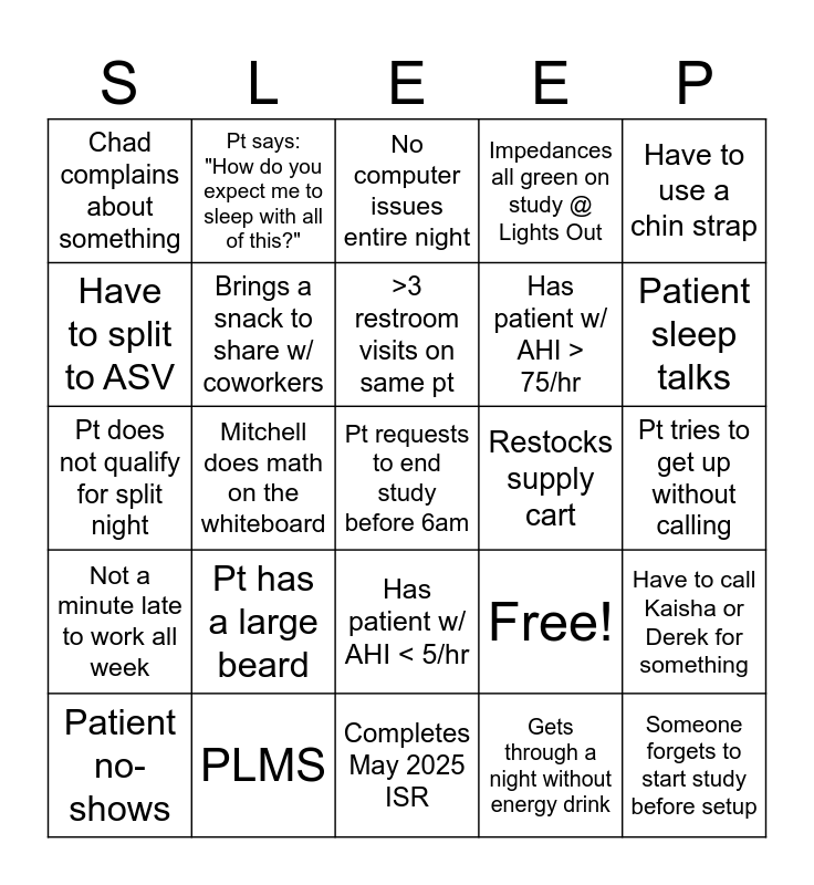 This bingo card has 25 words: Pt has a large beard, Completes May 2025 ISR, >3 restroom visits on same pt, Patient no-shows, Have to use a chin strap, Chad complains about something, Have to split to ASV, Pt says: "How do you expect me to sleep with all of this?", Restocks supply cart, Has patient w/ AHI < 5/hr, Has patient w/ AHI > 75/hr, Pt does not qualify for split night, Free!, Have to call Kaisha or Derek for something, Brings a snack to share w/ coworkers, Someone forgets to start study before setup, Pt tries to get up without calling, No computer issues entire night, Patient sleep talks, Mitchell does math on the whiteboard, Pt requests to end study before 6am, PLMS, Not a minute late to work all week, Impedances all green on study @ Lights Out and Gets through a night without energy drink.